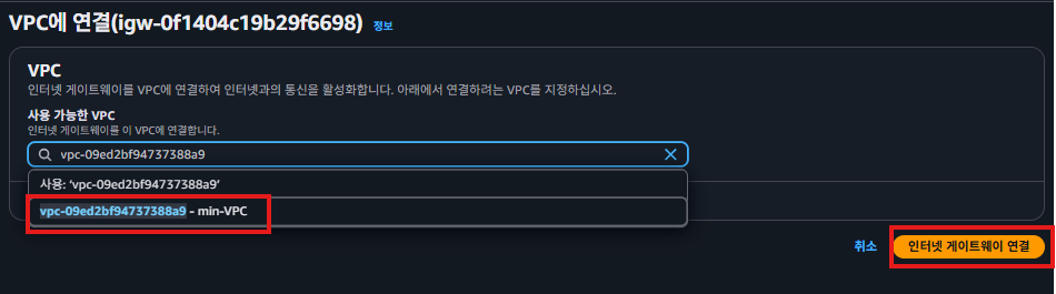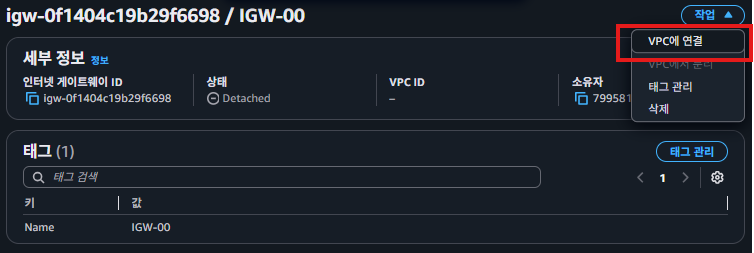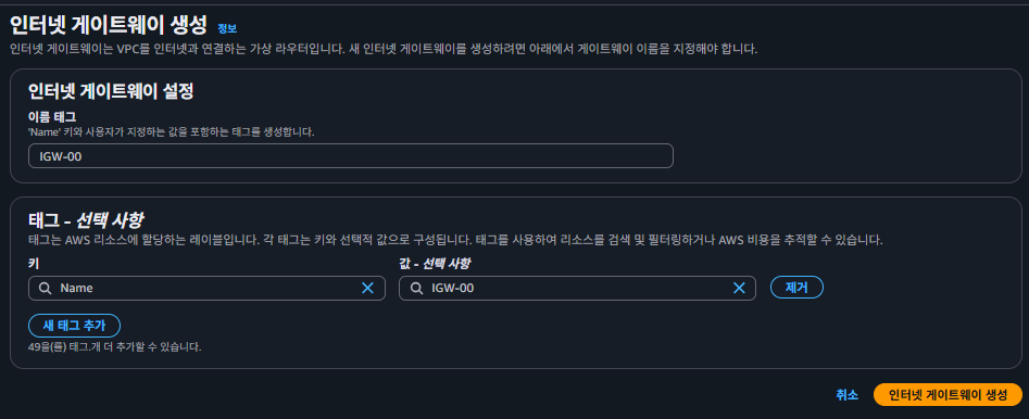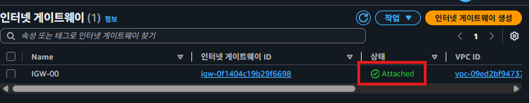- Internet Gateway : Internet(Public Network)와 1:1로 연결(NAT)