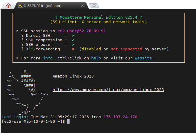이제 해당 퍼블릭 IP로 SSH 접속해 원하는 작업을 할 수 있습니다.