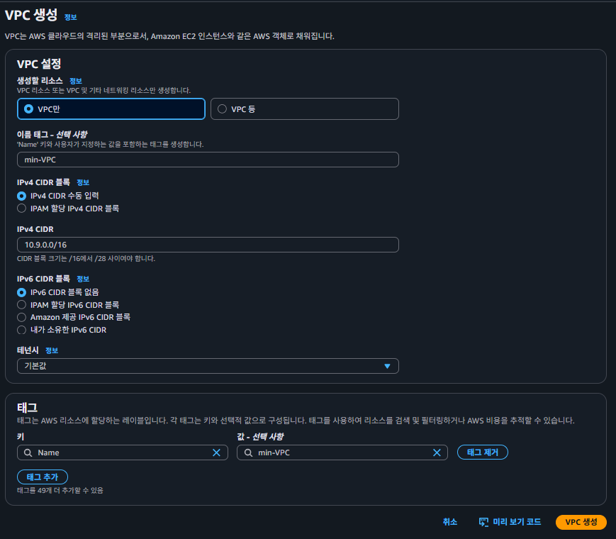 AWS에서 VPC 검색 → VPC → VPC 생성
