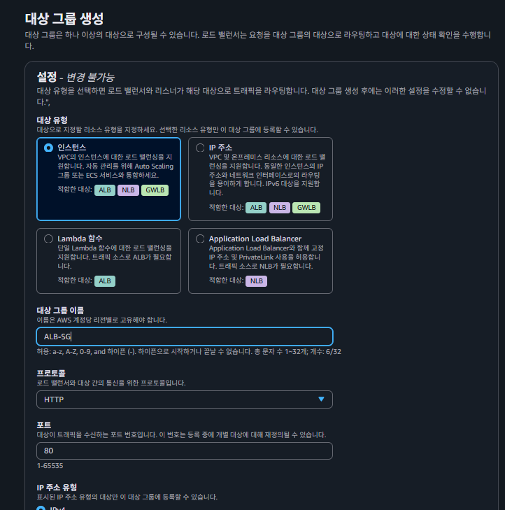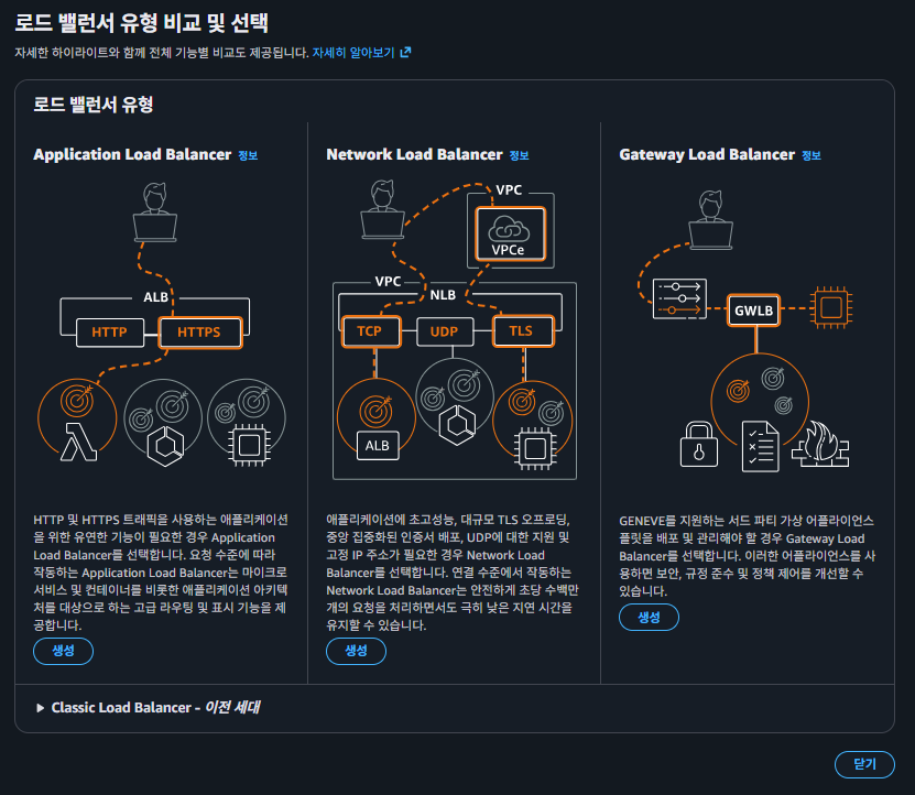 각각에 맞는 유형을 선택해 생성하면 되지만 여기선 ALB를 기준으로 설명하겠습니다.