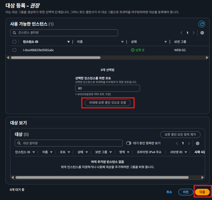 로드 밸런싱 할 인스턴스를 체크 후 포함 시키면 됩니다.