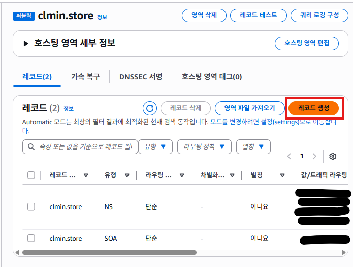특징: 생성 시 자동으로 4개의 NS(Name Server) 레코드와 1개의 SOA 레코드가 생성됩니다.