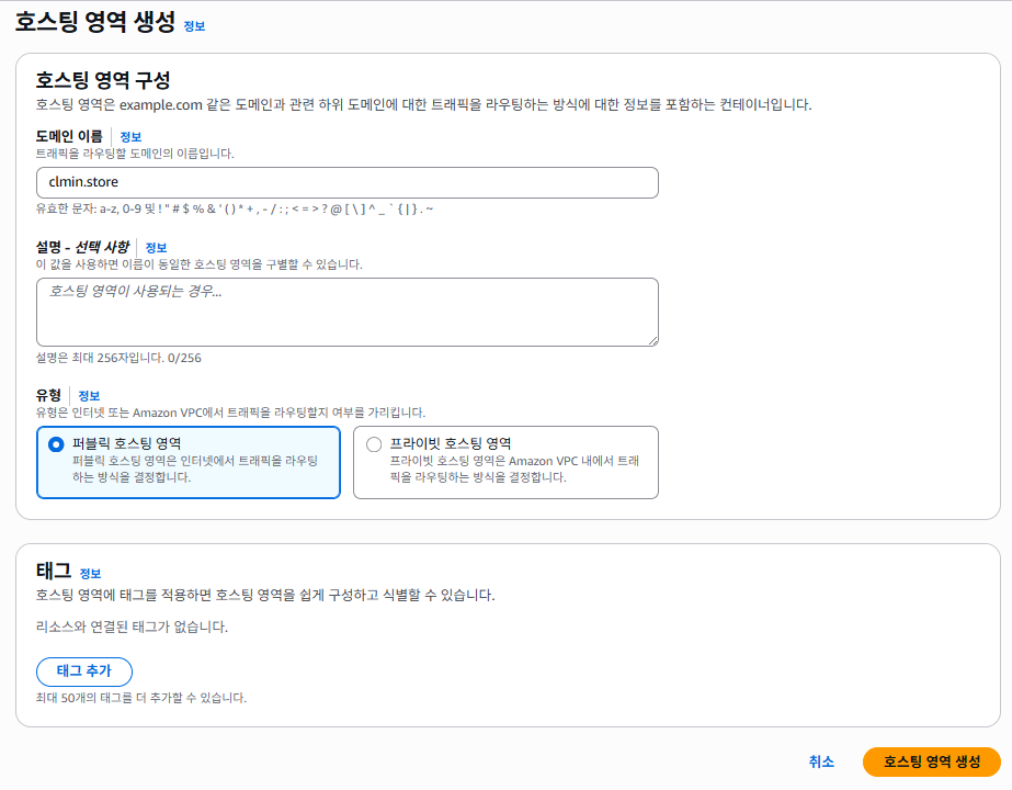 AWS에서 Route 53 검색 → 호스팅 영역 → 호스팅 영역 생성