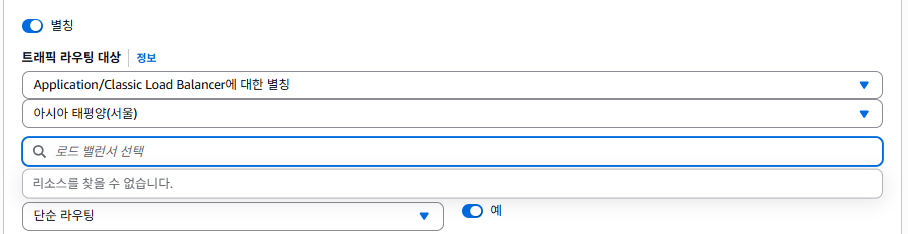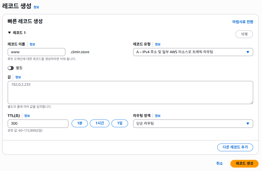 레코드 등록 시 특정 IP 주소를 직접 입력하거나 별칭 기능을 통해 AWS 내부 리소스를 선택하여 연결할 수 있습니다.