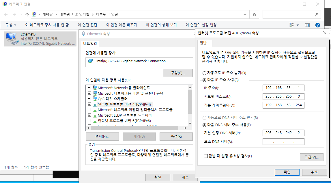 네트워크 연결에서 DHCP 에서 설정한 게이트웨이 설정까지 완료했다면 작업은 서버 작업은 끝입니다.