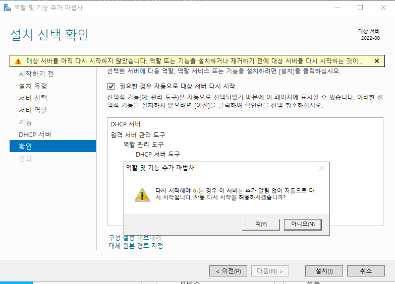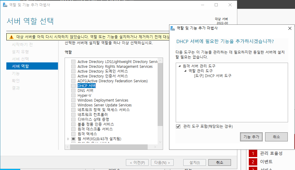 해당 서버 역할 선택에서 DHCP 를 체크하고 진행해줍니다.