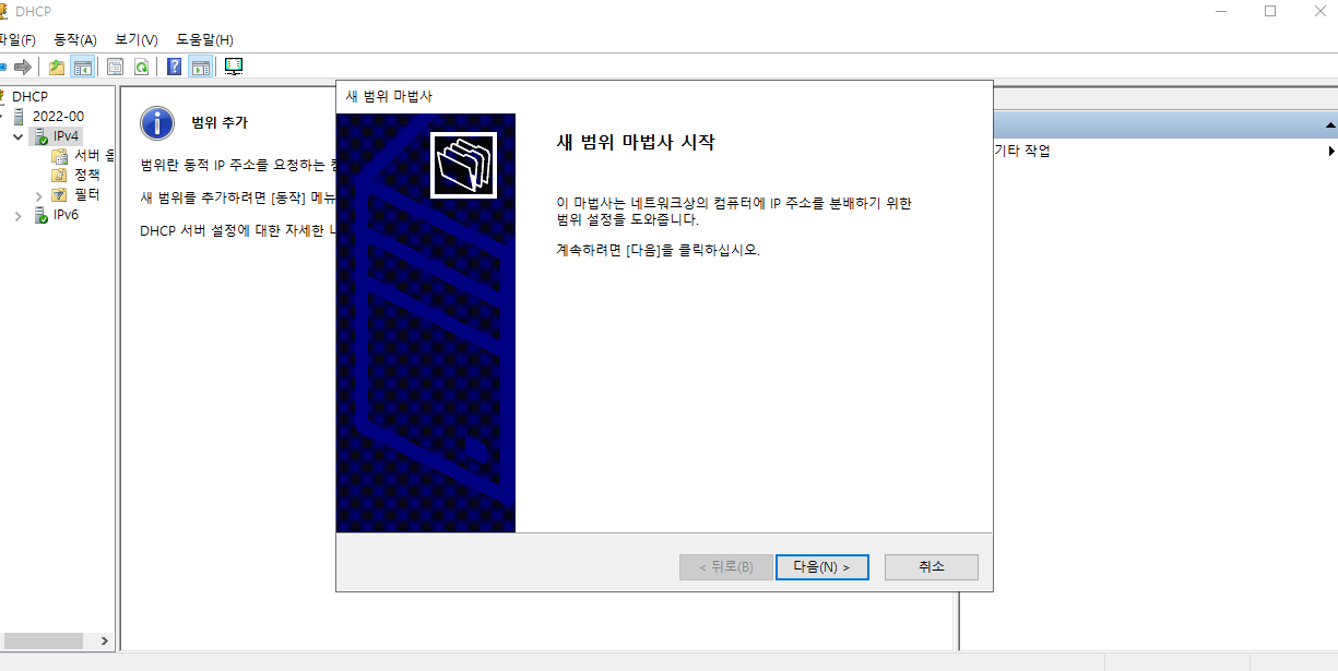 IPv4 우클릭 누른 후 새 범위 클릭 후 아래의 정보들을 입력해줍니다.