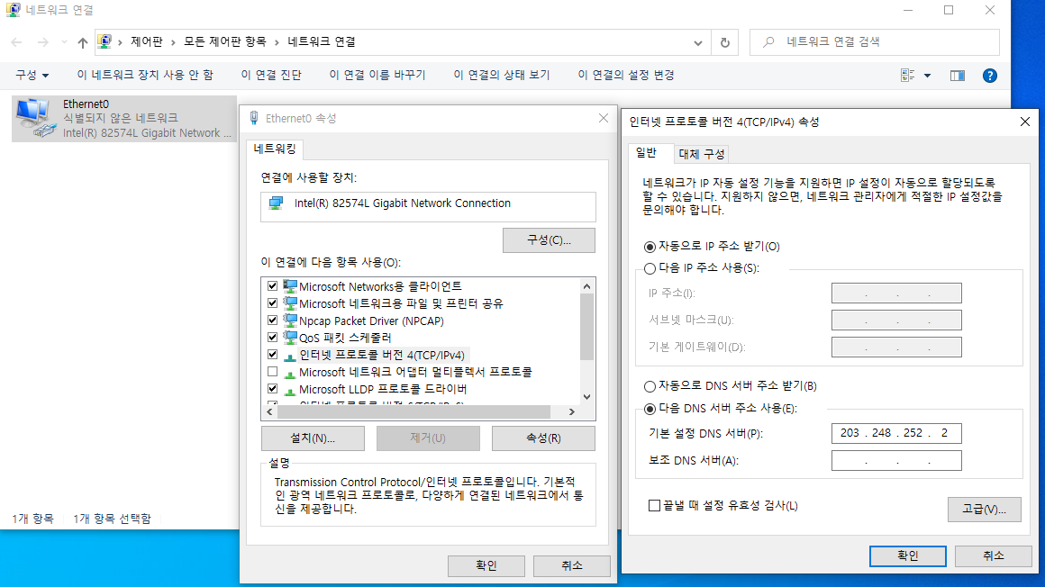 해당 PC로 가서 DHCP가 잘 작동하는지 확인하기 위해 네트워크 연결에서 자동으로 IP 주소 받기 로 변경합니다.