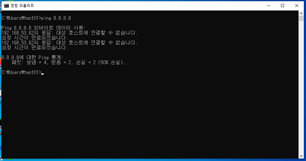 모든 설정이 끝나고 가상윈도우(Guest)에서 8.8.8.8(Google DNS)외부에 ping을 보내보면