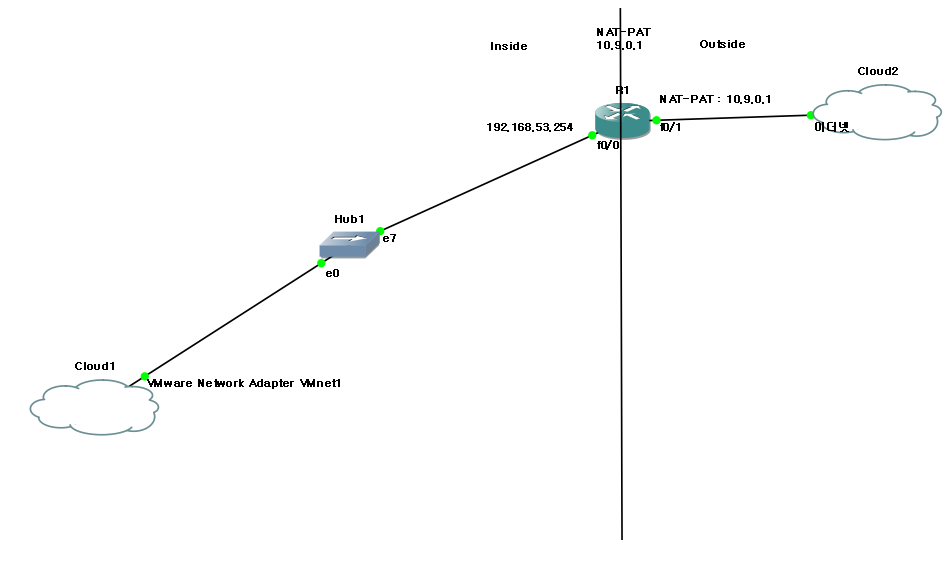 GNS3에서 아래의 사진처럼 작업을 기반 작업을 해준 뒤 NAT를 이용해 외부와 통신 하는 작업을 해보겠습니다.
