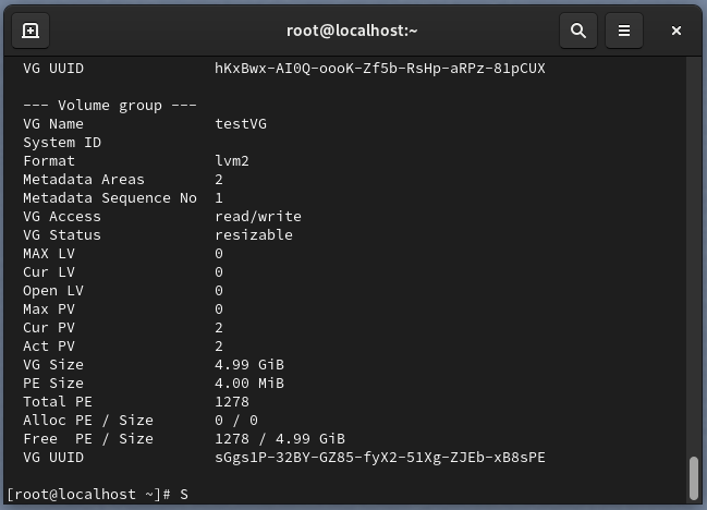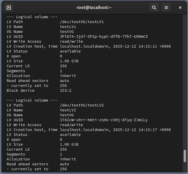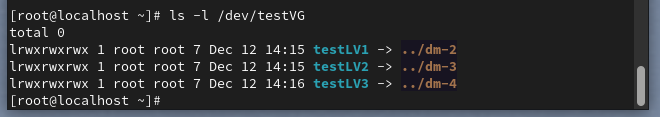 [root@localhost ~]# lvcreate --size 1G --name testLV2 testVG