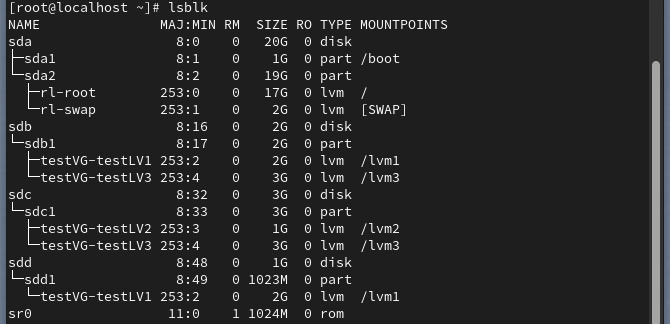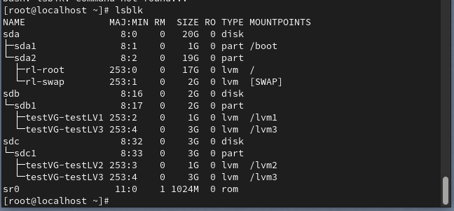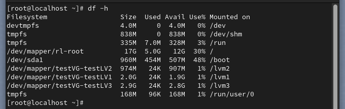 [root@localhost ~]# mount /dev/testVG/testLV3 /lvm1