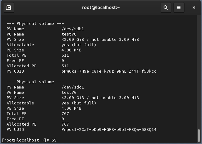 [root@localhost ~]# vgcreate /dev/testVG /dev/sdb1 /dev/sdc1