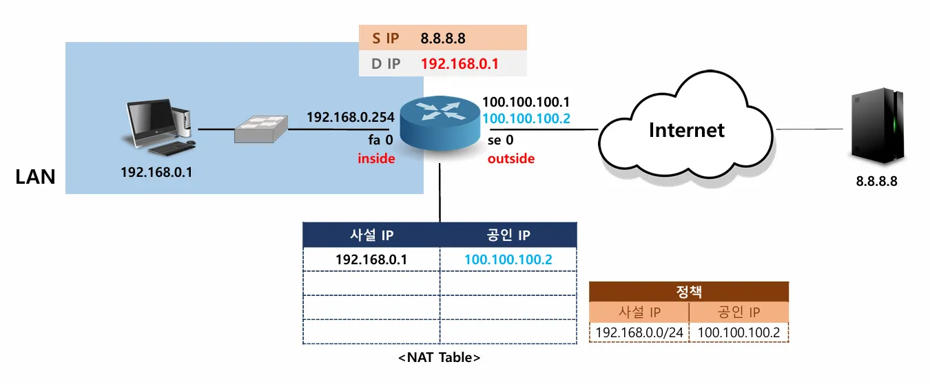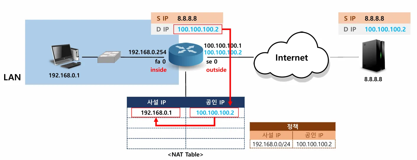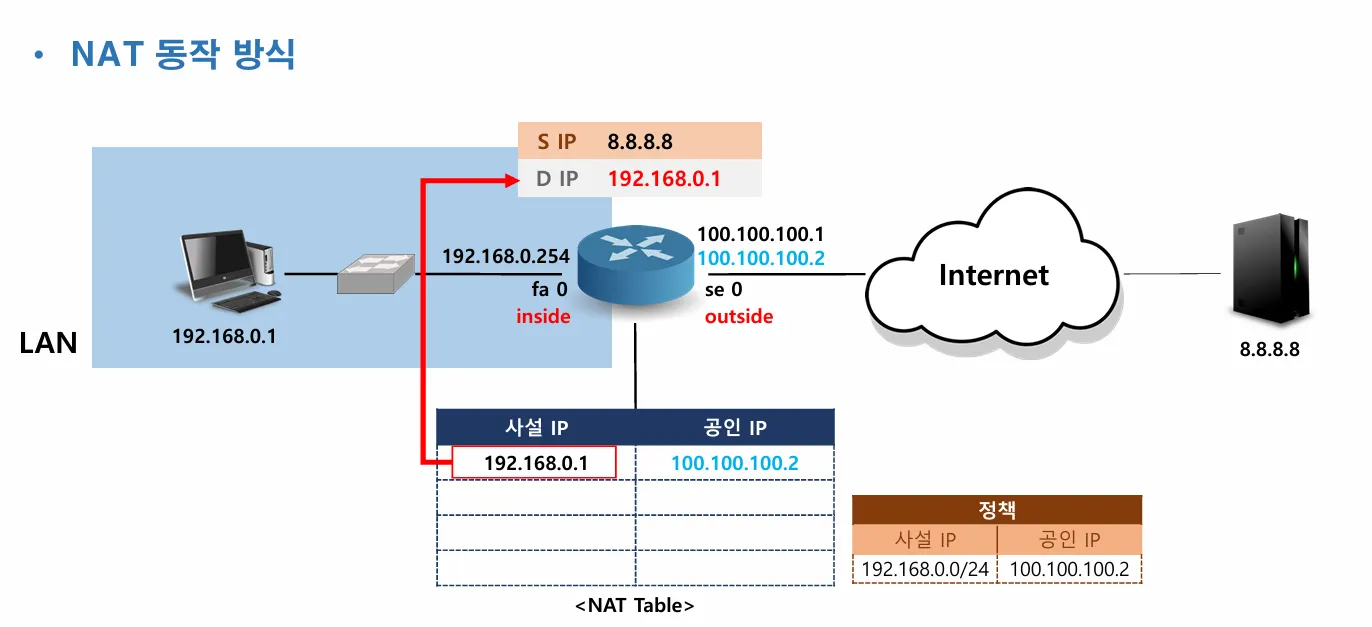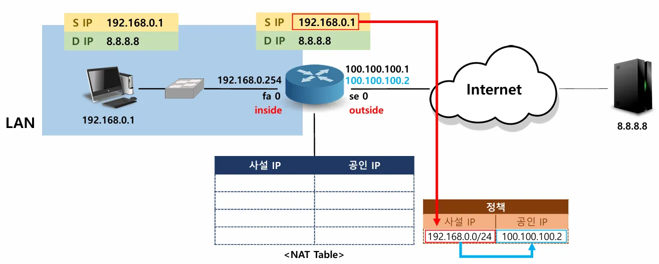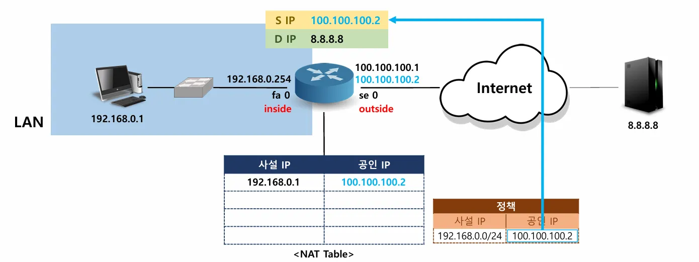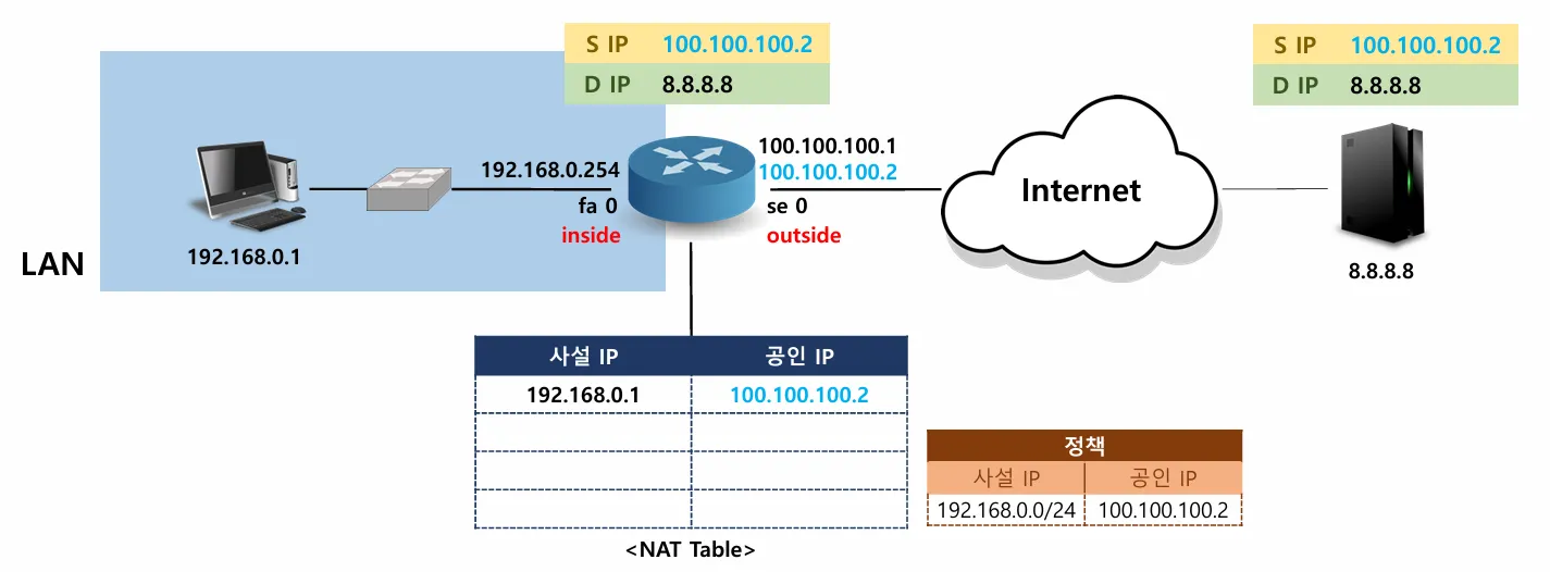출발지의 IP 주소를 사설 IP에서 공인 IP로 변경 (내부에서 외부로 나갈때)