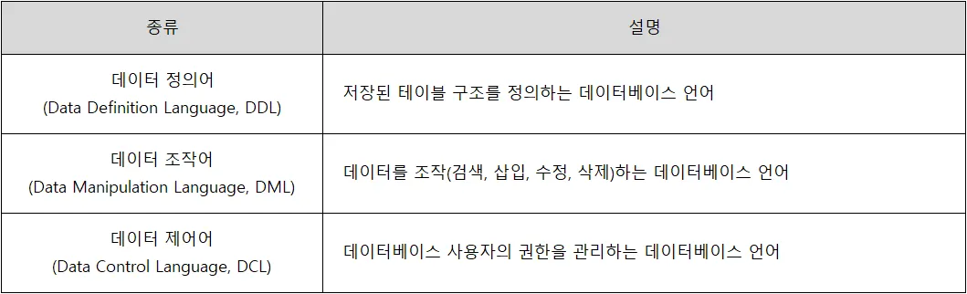 | DML | 데이터 조작 | SELECT, INSERT, UPDATE, DELETE |