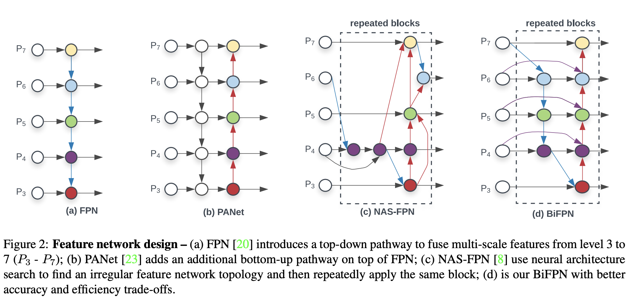 (a)RetinaNet FPN보다 층이 하나 더 많음. 내려가면서 upsampling하면서 더해짐