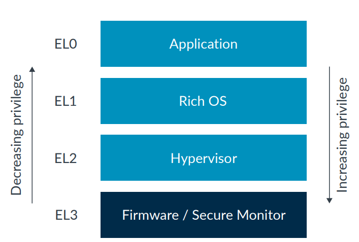 AArch64 아키텍처는 이러한 분할을 가능하게 하기 위해 다양한 수준의 권한을 구현한다. 권한 수준은 프로세서가 예외를 발생시키거나 예외에서 돌아올 때만 변경될 수 있다. Arm 아키텍처에서는 이러한 권한 수준을 예외 수준(Exception level)이라고 한다.
