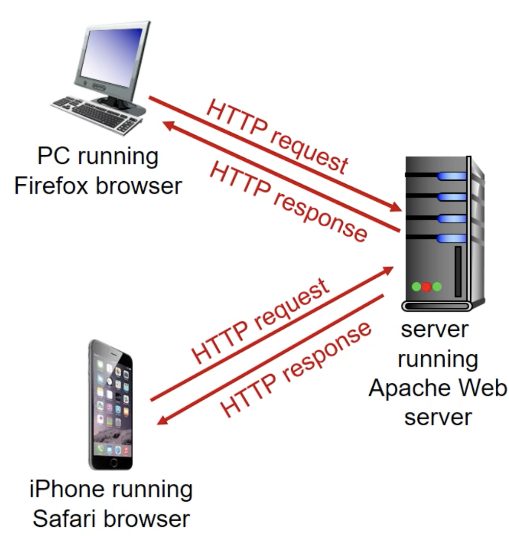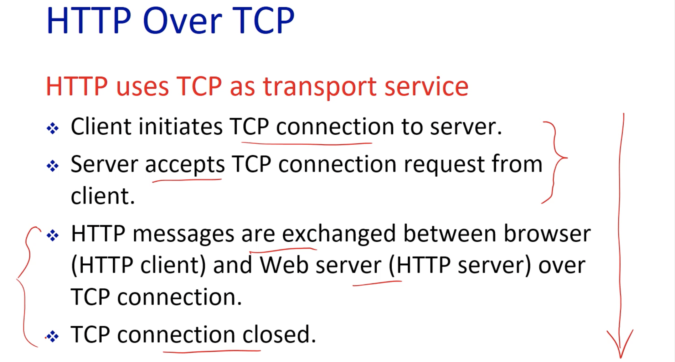 - TCP Connection is requested first, then HTTP messages are exchanged. After successful transmission, connection is closed.