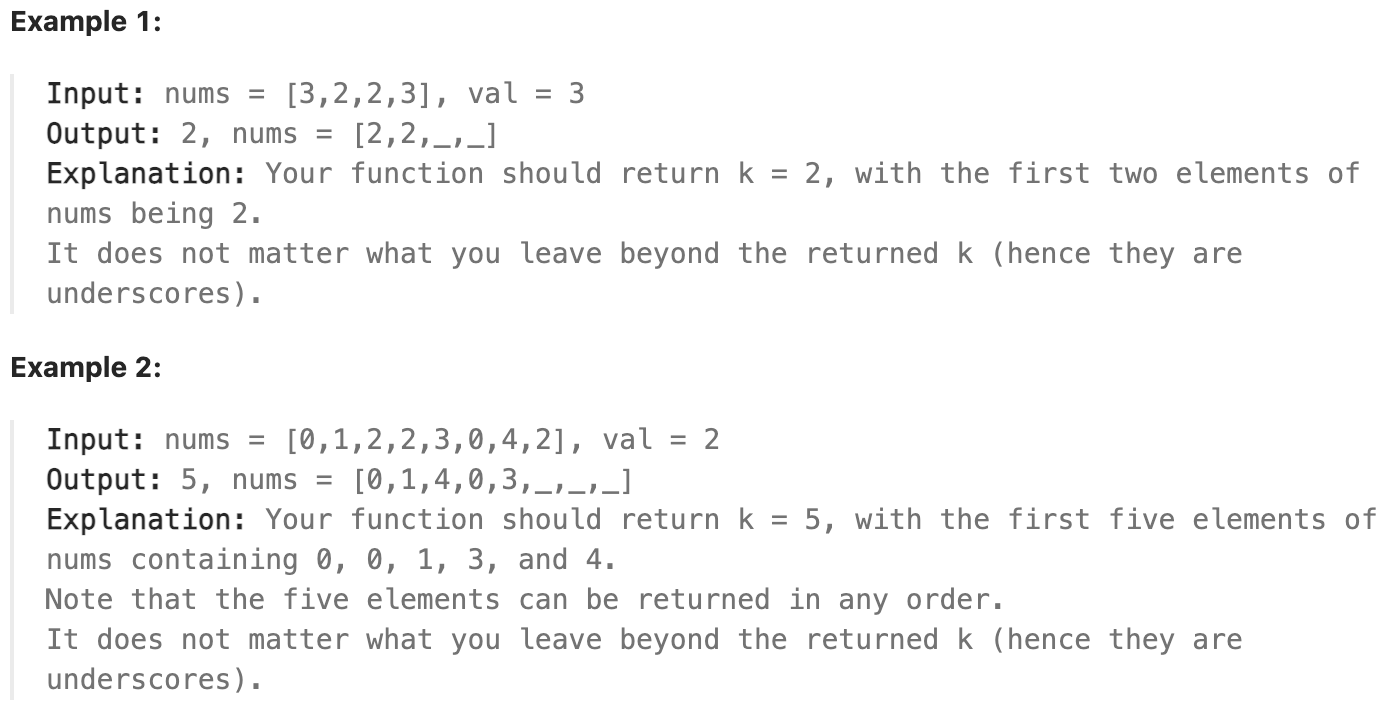 그러므로 하나의 포인터는 현재 overwrite 해야하는 인덱스, 다른 하나는 remove 할 val을 건너뛴 다음 overwrite에 사용될 값을 가리키면 된다.