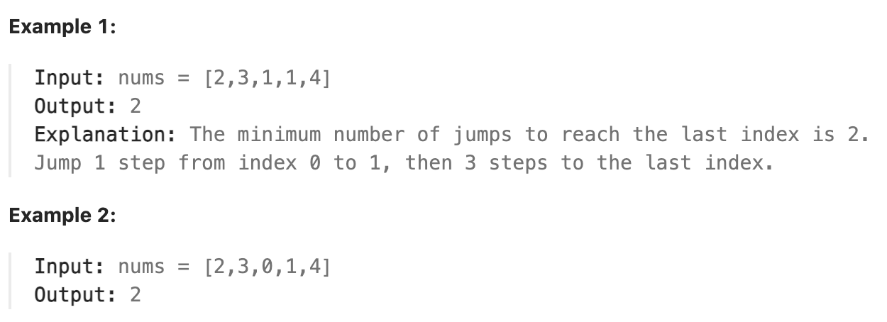 Greedy algorithm 을 사용하는 것이다. 제일 멀리 갈 수 있는 position을 정하고 이전에 정해진 position에 다다를때 jump count를 하나 올리고 다음 end position으로 업데이트한다.