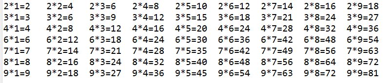 System.out.print(i+"*"+e+"="+(i*e)+"\t");