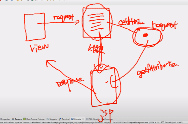 jsp에서는 서블릿에서 공유한 데이터를 꺼내서 출력하는 일만 담당