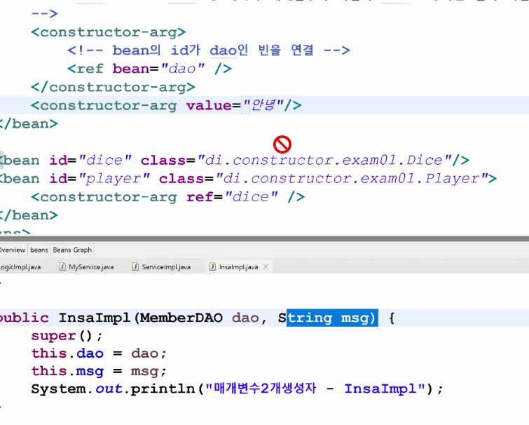 <!-- constructor-arg가 정의된 갯수를 보면서 매개변수가 몇 개인지 파악