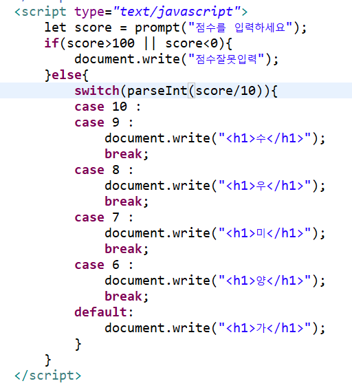 prompt로 점수를 입력받아 수, 우, 미,양, 가 출력하기