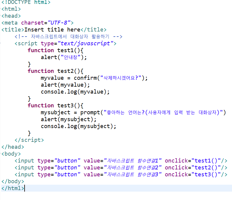 <input type="button" value="자바스크립트 외부문서에 정의된 함수 호출하기" onclick="test2()"/>