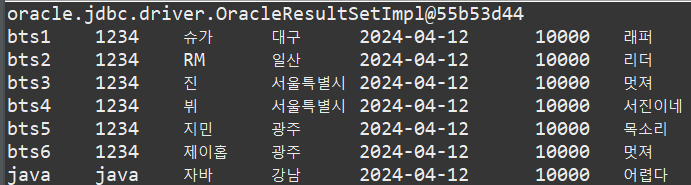 SQL> insert into member values ('bts1','1234','슈가','대구',sysdate,10000,'래퍼');