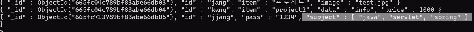 { "_id" : ObjectId("665fd19a6664373c55011c4a"), "id" : "lee", "name" : "이문세" }