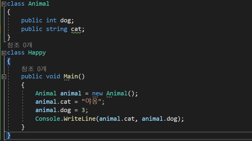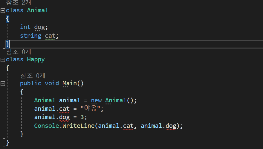 <예시_1-1> 같이 public을 선언하면 Animal 클래스에 있는 int dog와 string cat을 호출할 수 있다.