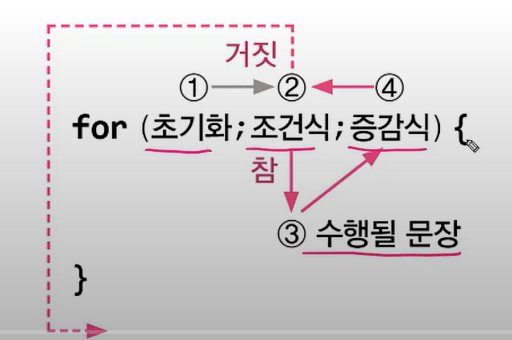 for문은 조건식이 거짓이 될때까지 계속 문장을 수행한다.