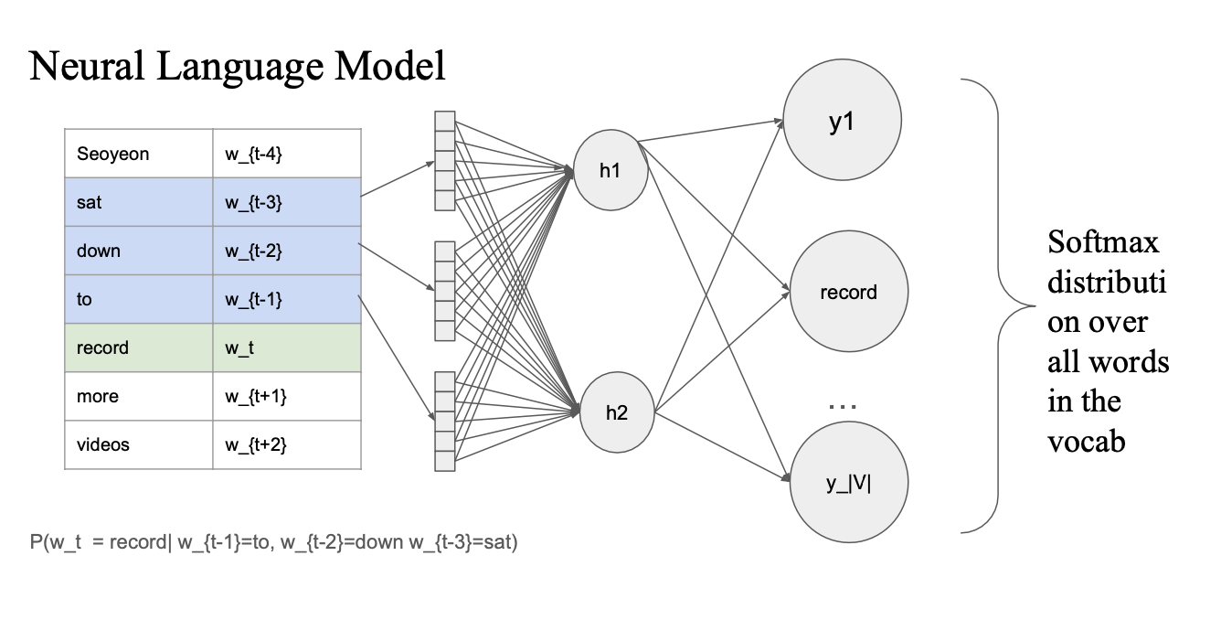 이전까지는 (n-gram LM)prob을 어떤 corpus 가 존재한다고 했을 때 모두 계산해두고 이 결과를 모델로 썼던 건데