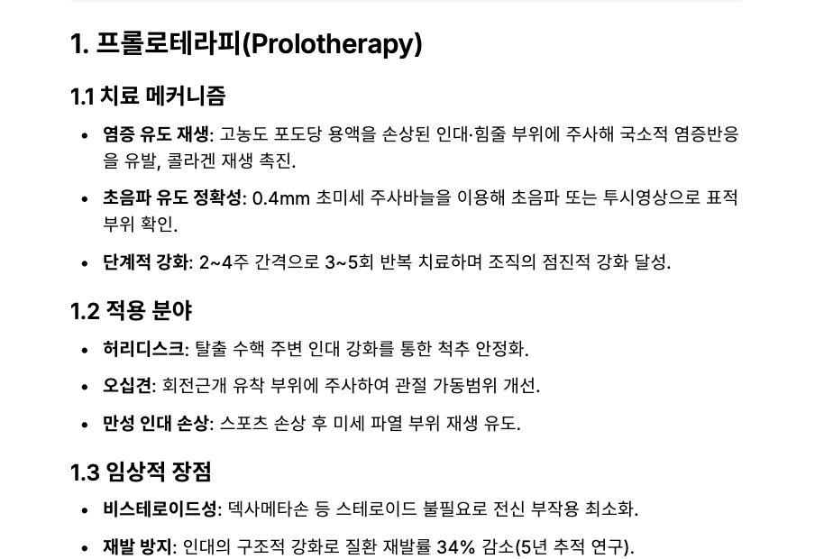 "summary": "- 증상: 무릎 관절 통증, 계단을 오르내릴 때 통증, 소리, 불편함.\n- 진단: 무릎 관절의 증식통증 가능성.\n- 치료: 프롤로테라피 (포도당, 증식제 주입) 적용.\n- 특이사항: 자가 혈액을 이용한 치료 가능.\n- 환자 반응: 2-3주 간격으로 4-6회 치료를 통해 호전 효과를 보임."