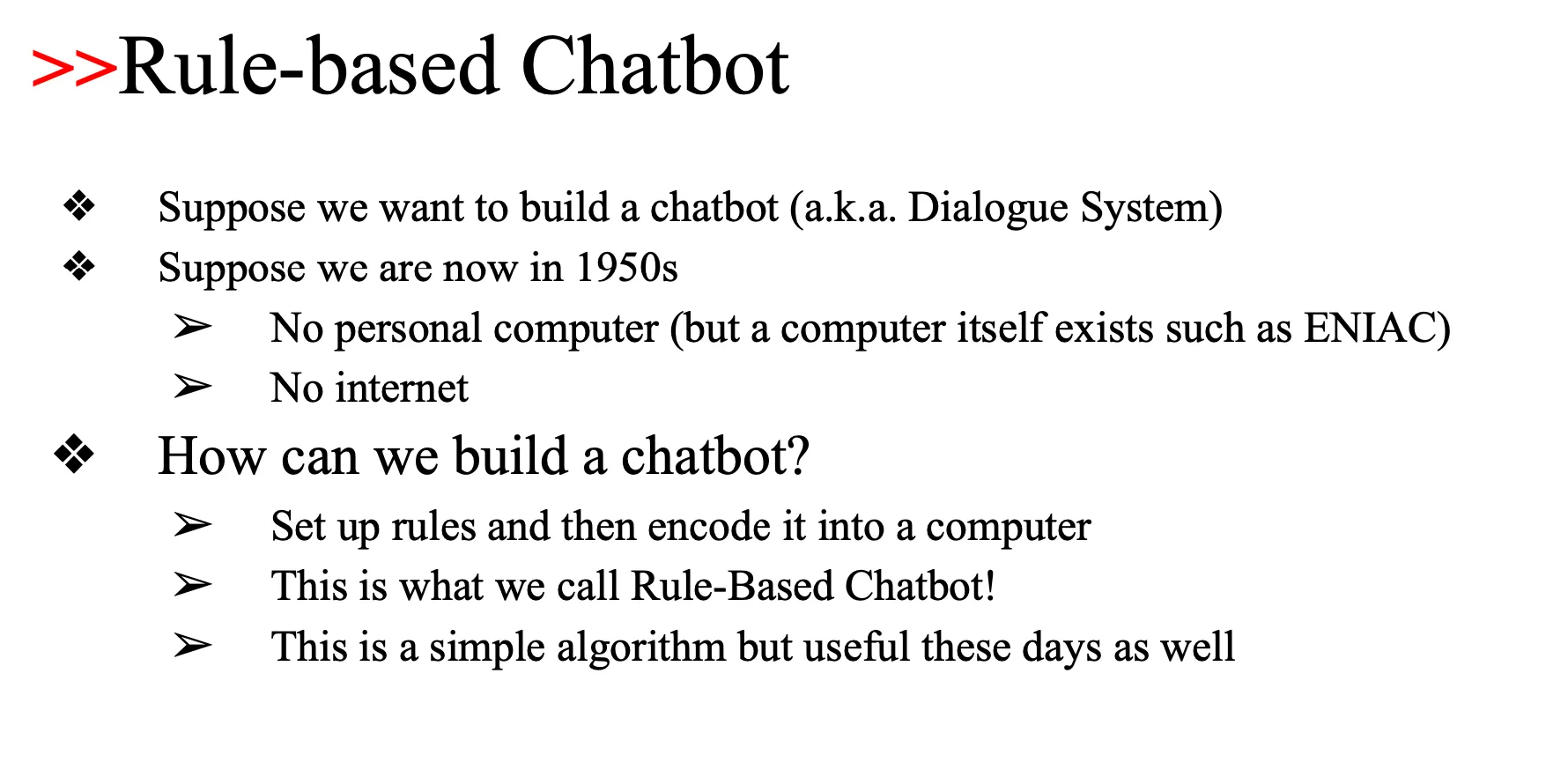 초창기 챗봇 구현 방식 중 하나로, 미리 정의된 규칙(Rule) 사람이 set up 해놓음