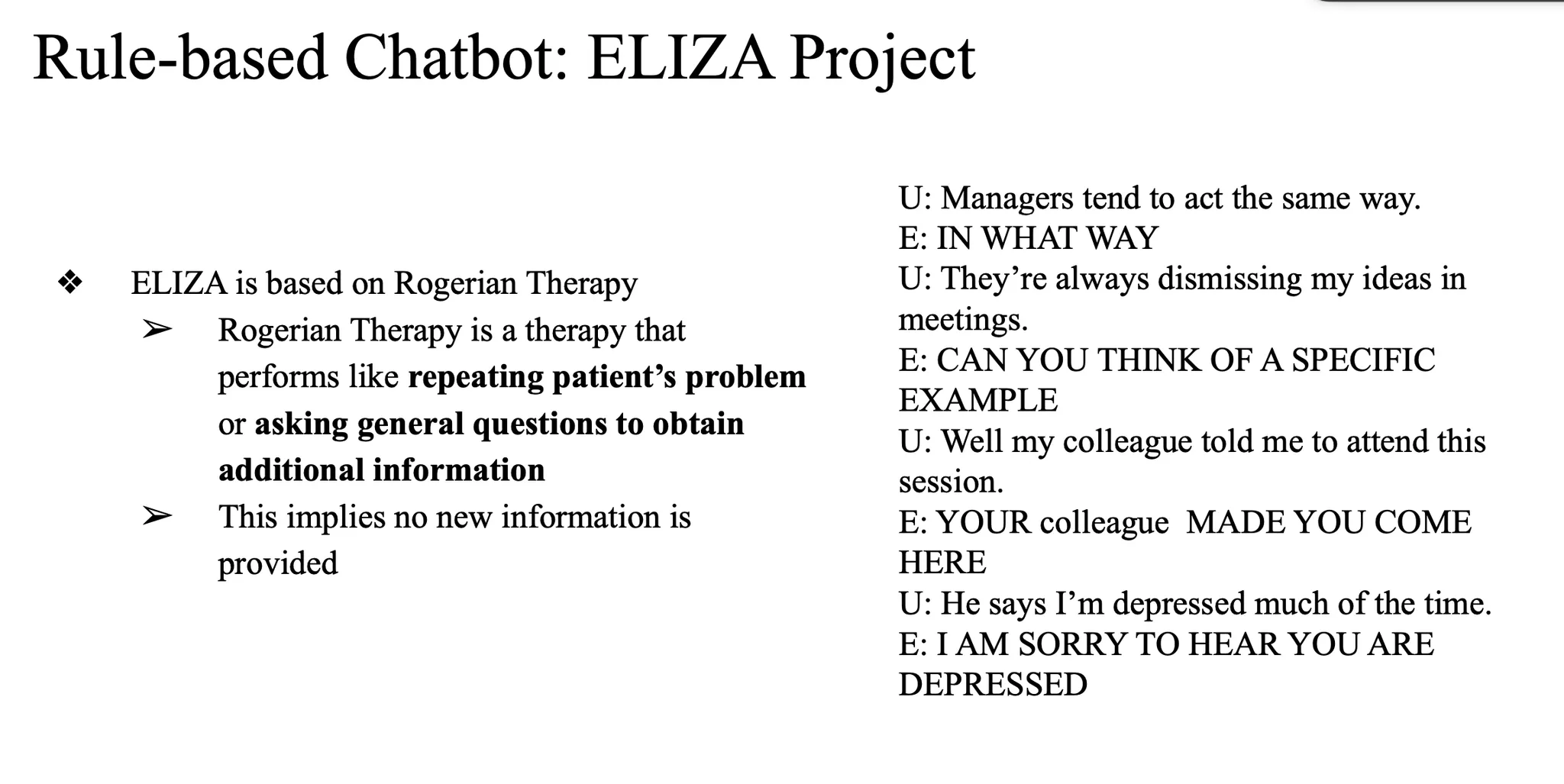 - 일단 바로 대답: (my .*) -> (YOUR \2) 같은 우선순위 높은 규칙 써서 "YOUR manager..."라고 대답함.