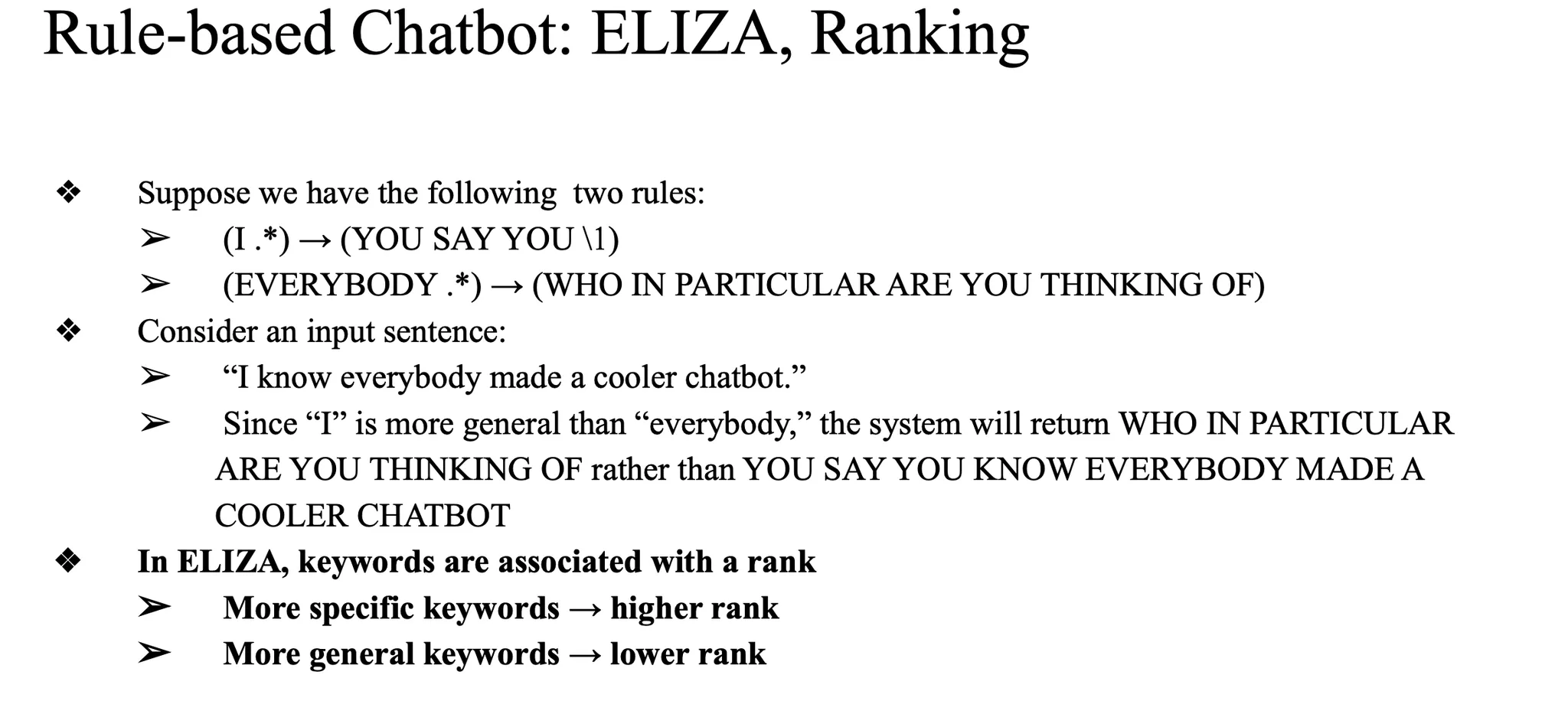 - 가장 일반적인 규칙 (.*) -> IN WHAT WAY (Rank 3)도 매치되지만,