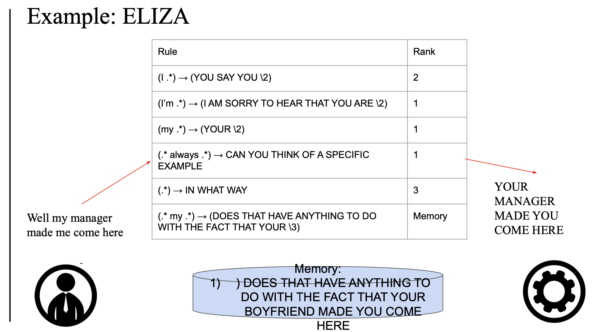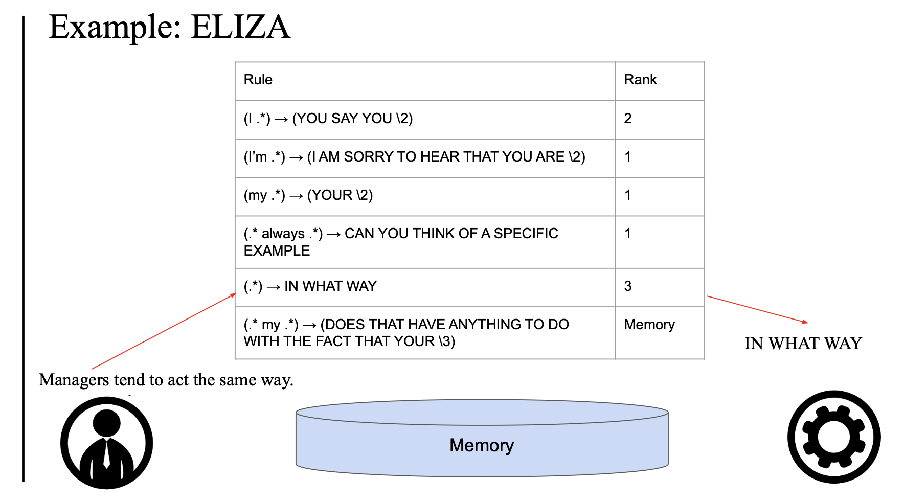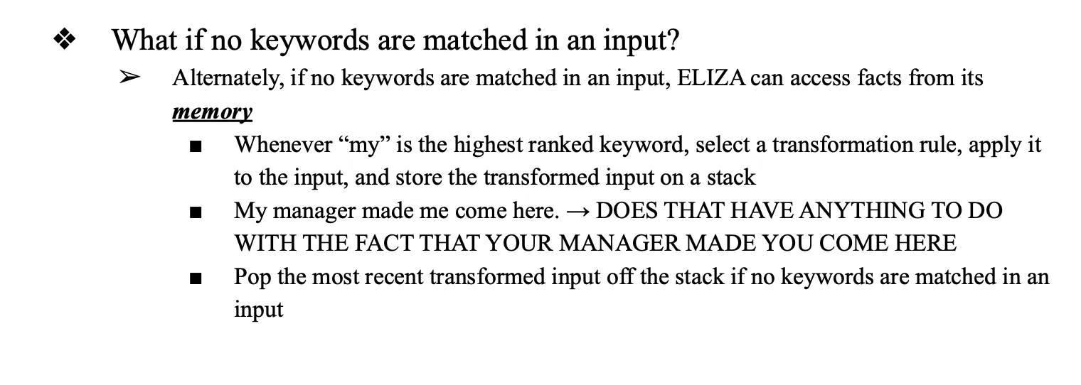 결론적으로, 이 예시는 ELIZA가 사용자의 현재 발언에서 특별한 키워드를 찾지 못했을 때, 이전에 저장해 둔 (과거 대화와 관련된) 문장을 활용하여 응답하는 '메모리' 기능을 보여줍니다. 이를 통해 마치 챗봇이 대화의 맥락을 어느 정도 기억하는 것처럼 보이게 만듭니다.