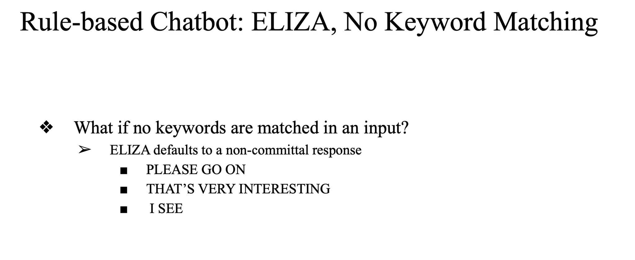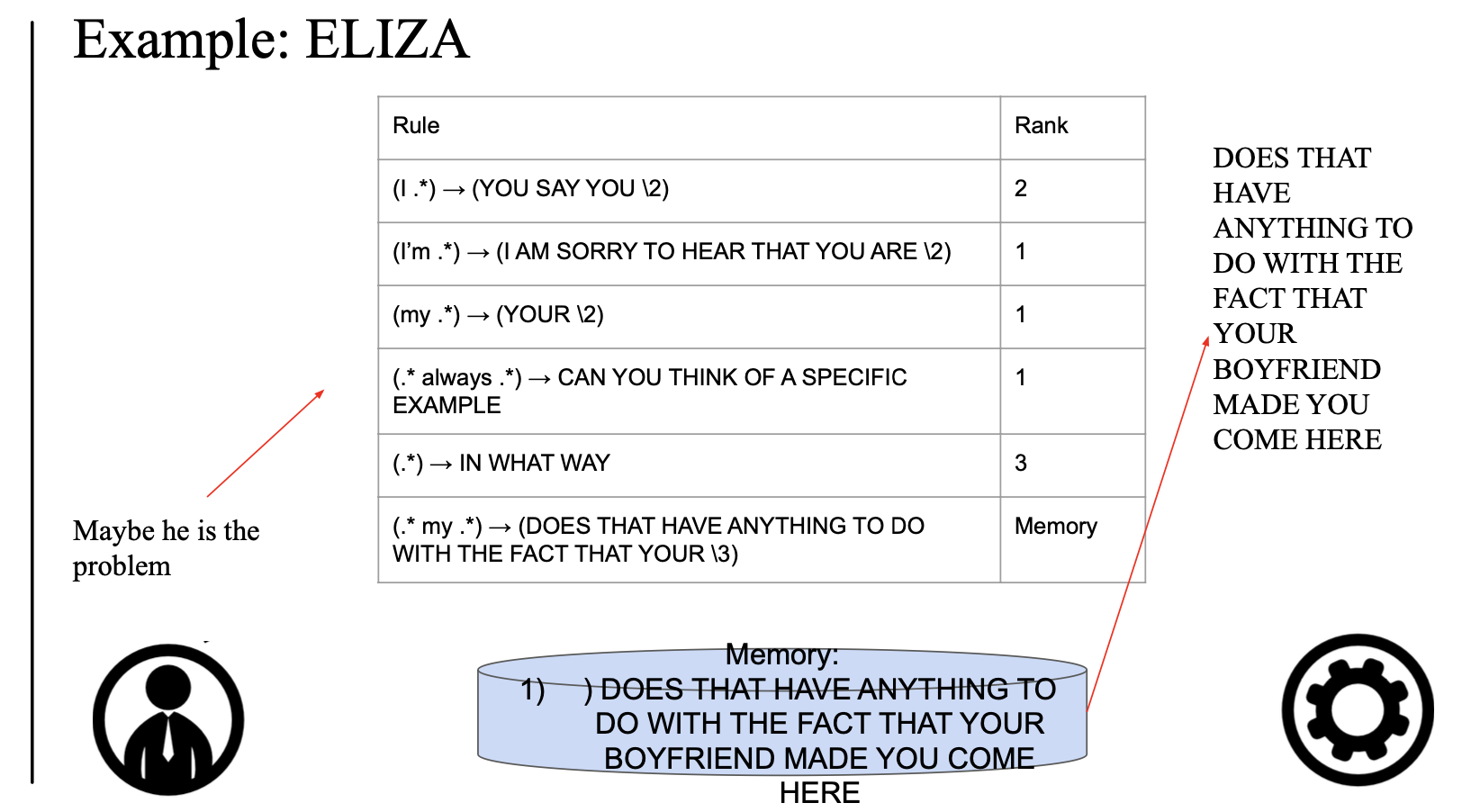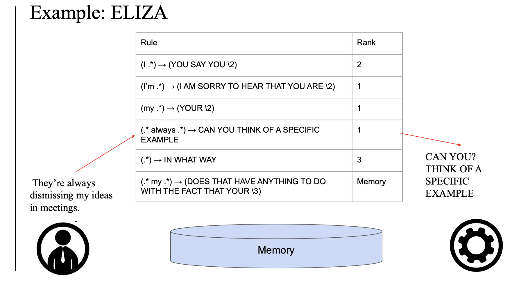 결론적으로, 이 예시는 ELIZA가 사용자의 현재 발언에서 특별한 키워드를 찾지 못했을 때, 이전에 저장해 둔 (과거 대화와 관련된) 문장을 활용하여 응답하는 '메모리' 기능을 보여줍니다. 이를 통해 마치 챗봇이 대화의 맥락을 어느 정도 기억하는 것처럼 보이게 만듭니다.