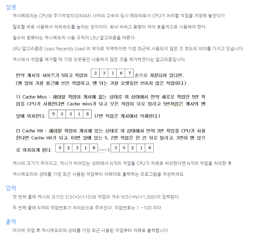 import java.util.*; public class Main { public int[] solution(int s, int n, int[] arr) { int[] cache = new int[s]; for (int x : arr) { //주어진 작업을 하나씩 돌면서 처리 int pos = -1; for (int i = 0; i < s; i++) { //cache를 돌면서 hit 가 있는지 확인 if(x == cache[i]) pos = i; } if (pos == -1) { //hit 가 없으면 위치 하나씩 뒤로 옮기기 for (int i = s - 1; i >= 1; i--) { cache[i] = cache[i - 1]; } cache[0] = x;// 새로운 작업 첫자리에 넣기 }else { //hit가 있으면 hit 자리서부터 뒤로 옮기기 for (int i = pos; i >= 1; i--) { cache[i] = cache[i - 1]; } cache[0] =x; } } return cache; } public static void main(String[] args) { Main T = new Main(); Scanner kb = new Scanner(System.in); int s = kb.nextInt(); int n = kb.nextInt(); int[] arr = new int[n]; for (int i = 0; i < n; i++) { arr[i] = kb.nextInt(); } for (int x : T.solution(s, n, arr)) { System.out.print(x + " "); } } }