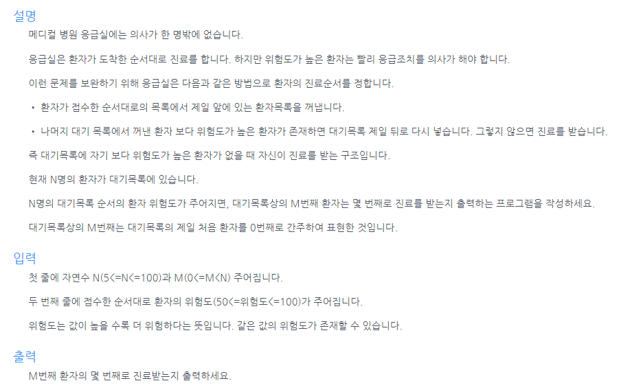import java.util.*; class Person { int id; int priority; public Person(int id, int priority) { this.id = id; this.priority = priority; } } public class Main { public int solution(int n, int m, int[] arr) { int answer = 0; Queue<Person> Q = new LinkedList<>(); for (int i = 0; i < n; i++) { Q.offer(new Person(i, arr[i])); } while (!Q.isEmpty()) { Person tmp = Q.poll(); for (Person x : Q) { if (x.priority > tmp.priority) { Q.offer(tmp); tmp= null; break; } } if (tmp != null) { answer++; if(tmp.id==m) return answer; } } return answer; } public static void main(String[] args) { Main T = new Main(); Scanner kb = new Scanner(System.in); int n = kb.nextInt(); int m = kb.nextInt(); int[] arr = new int[n]; for (int i = 0; i < n; i++) { arr[i] = kb.nextInt(); } System.out.println(T.solution(n,m,arr)); } }