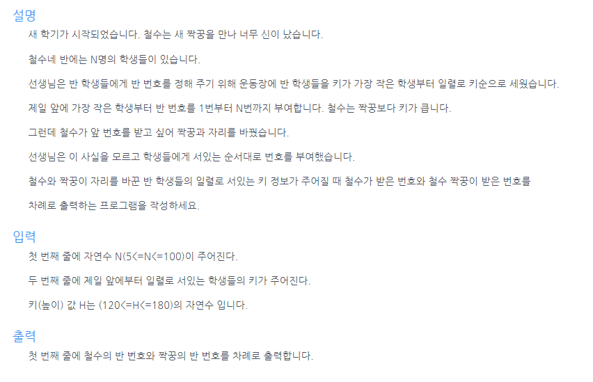 import java.util.*; public List<Integer> solution( int n, int[] arr) { List<Integer> answer = new ArrayList<>(); int[] tmp = arr.clone(); Arrays.sort(tmp); for (int i = 0; i < n; i++) { if (tmp[i] != arr[i]) { answer.add(i+1); } } return answer; } public static void main(String[] args) { Main T = new Main(); Scanner kb = new Scanner(System.in); int n = kb.nextInt(); int[] arr = new int[n]; for (int i = 0; i < n; i++) { arr[i] = kb.nextInt(); } for (Integer x : T.solution(n,arr)) { System.out.print(x+" "); } } }