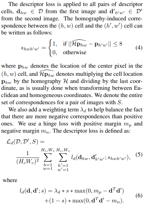 - Ld : 한 쌍의 두 이미지를 비교하는 방식인데, 첫번째 이미지와 두번째 이미지가 있을 때, 첫번째 이미지의 (h,w)의 중심점을 homography H에 대해 와핑해서 두번째 이미지 (h′,w′) 중심점과 거리를 비교하여 특정 thresholds=8 내에 있으면 1, 아니면 0으로 flag를 만든 후, hinge loss 를 활용해 적당한 마진을 두고(mp,mn) 두 descriptor vector dhw,dh′w′′가 같은 클래스에 속하는 지, 다른 클래스에 속하는 지에 대해 loss function을 정의하였다.