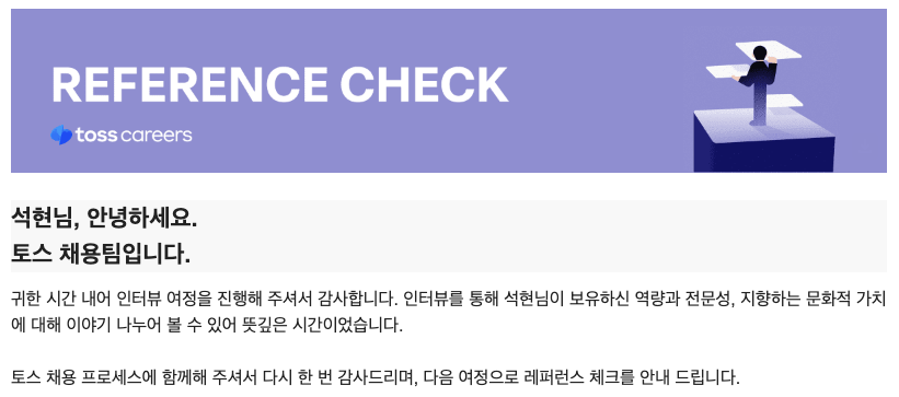 그렇게 레퍼런스 체크 메일을 전달받았고, 스무스하게 마지막 과정까지 진행됐고 최종적으로 입사 확정을 하게 되었다.