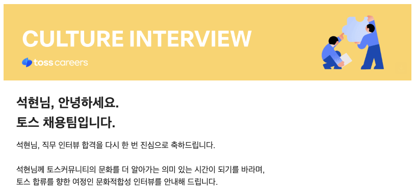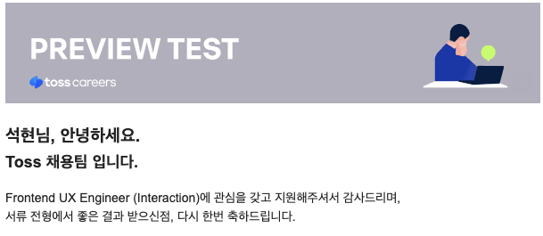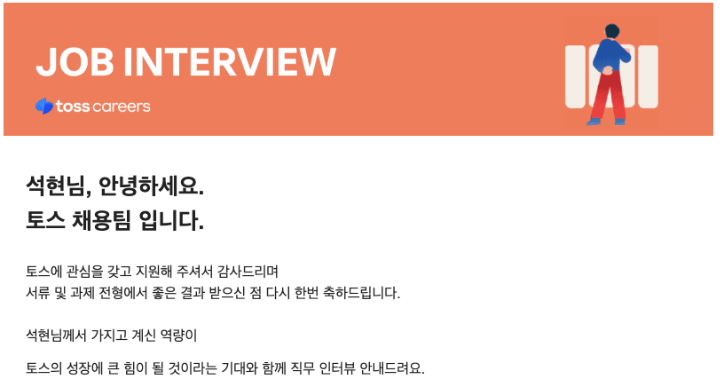 ??! 당연히 떨어질거라 생각했는데, 합격 연락을 받게 되었다. 사실 토스 코어는 매번 서류에서 불합격 했었어서 전혀 기대를 안하고 있었는데, 처음으로 합격하게 되었다.