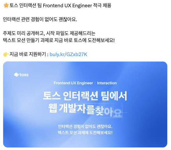지쳐있던 상황에서 토스의 인터랙션 개발을 직접 해볼 수 있으면 얼마나 좋을까...? 하던 시점에 딱 인터랙션 팀에서 UX 엔지니어 적극 채용 공고가 올라온걸 보게 되었다. 과제 내용도 미리 공개되어 있었는데, 너무 재밌어보였다. 🥲