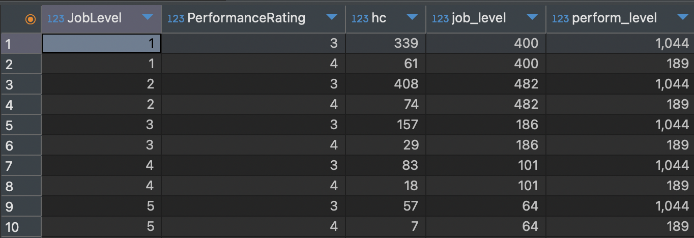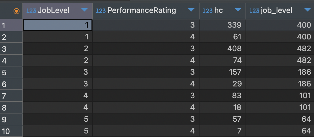 요약하지 않고, job level 이 같은 행에 그냥 중복값을 넣어줌으로써 null 값 없이, 요약 없이 표현해준다