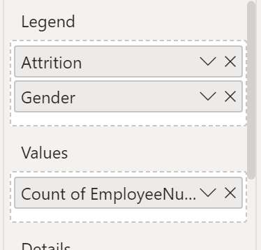 아래 화살표 하나있는 걸 한 번 누르면 드릴모드 그 상태에서 첫번째 범례 (attrition)으로 가서 no/yes를 선택하게 되면 드릴다운되어 범례 yes/no각각이 100%인 상태에서 여성과 남성의 비율을 보여주는 차트로 변하게 된다.