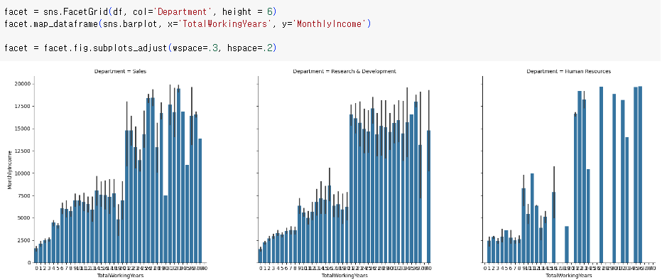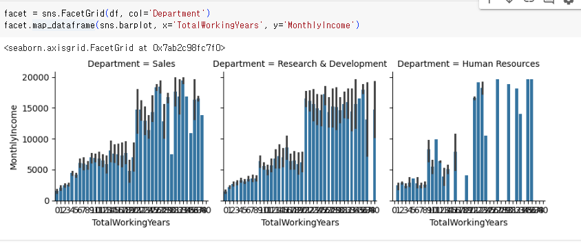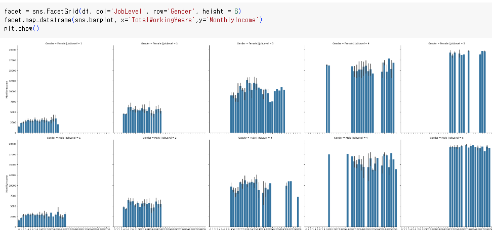 => 아까 만든 facet grid 를 맵핑할건데, 바그래프의, x축은 total working years 를, y 축에는 monthly income 을 넣어줘